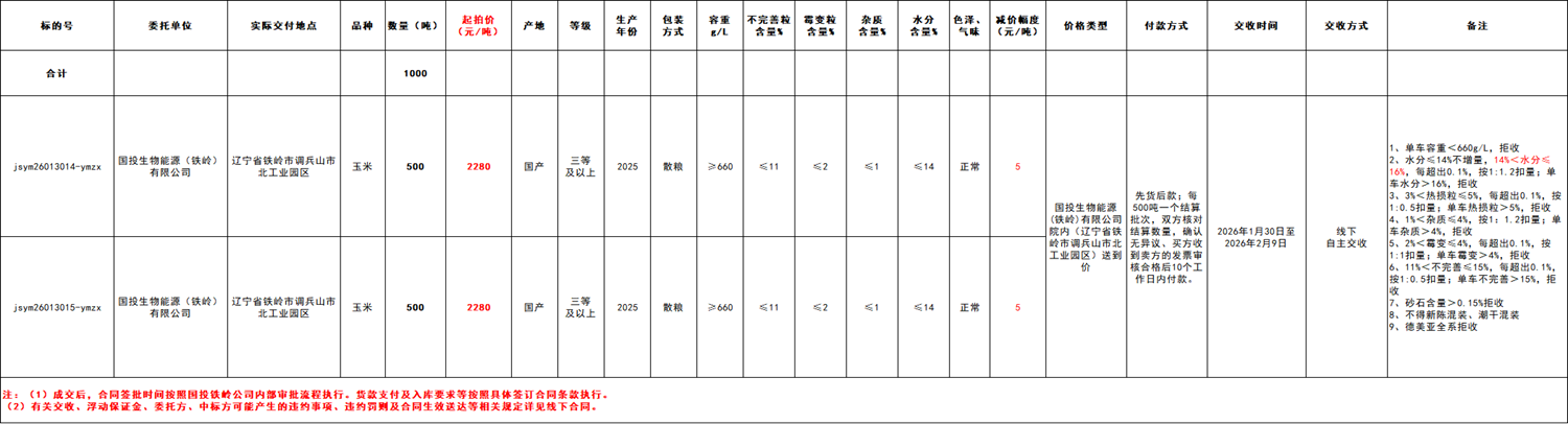 受国投生物能源(铁岭)有限公司委托,江苏粮油商品交易市场暨玉米分中心定于2026年1月30日 13:30 在“玉米分中心竞价采购交易专场”举办本次玉米竞价采购交易活动。具体事宜公告如下: