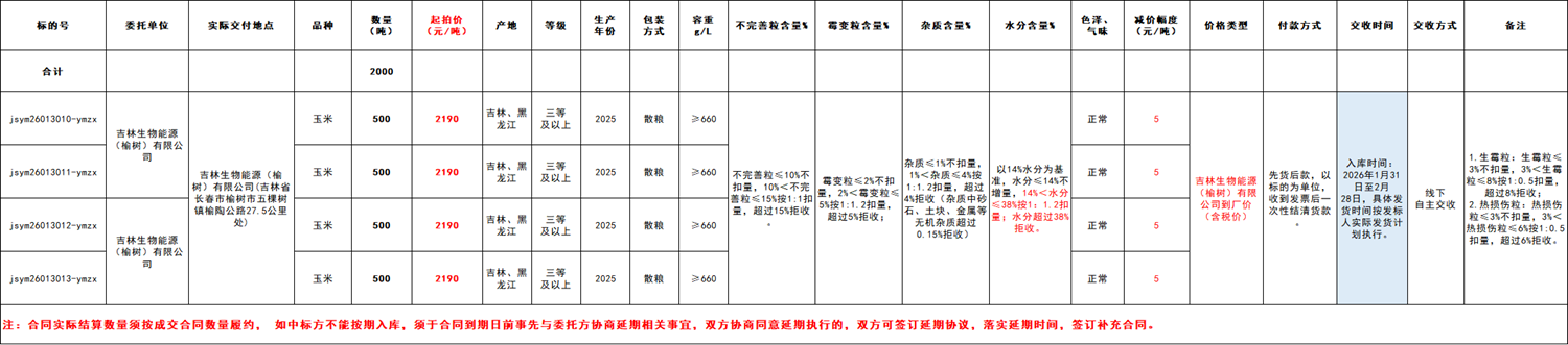 受吉林生物能源(榆树)有限公司委托,江苏粮油商品交易市场暨玉米分中心定于2026年1月30日 13:50 在“玉米分中心竞价采购交易专场”举办本次玉米竞价采购交易活动。具体事宜公告如下: