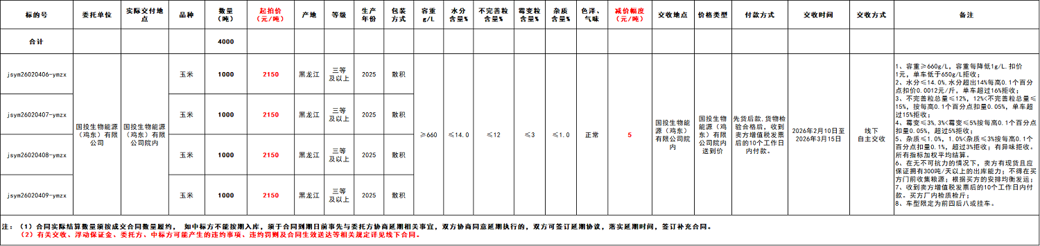 受国投生物能源(鸡东)有限公司委托,江苏粮油商品交易市场暨玉米分中心定于2026年2月4日 14:00在“玉米分中心竞价采购交易专场”举办本次玉米竞价采购交易活动。具体事宜公告如下: