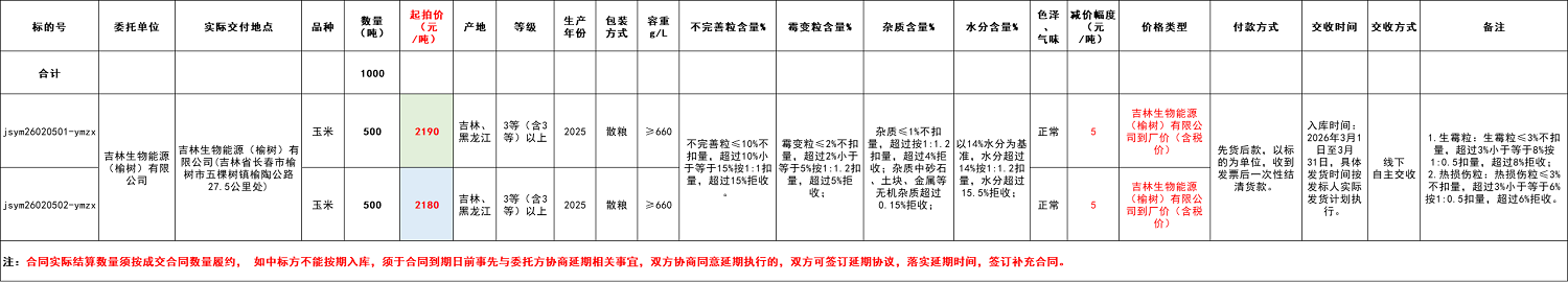 受吉林生物能源(榆树)有限公司委托,江苏粮油商品交易市场暨玉米分中心定于2026年2月5日 13:50在“玉米分中心竞价采购交易专场”举办本次玉米竞价采购交易活动。具体事宜公告如下: