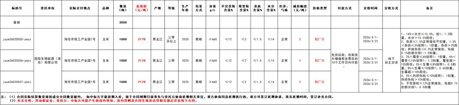 受国投生物能源(海伦)有限公司委托,江苏粮油商品交易市场暨玉米分中心定于2026年2月5日 14:30在“玉米分中心竞价采购交易专场”举办本次玉米竞价采购交易活动。具体事宜公告如下: