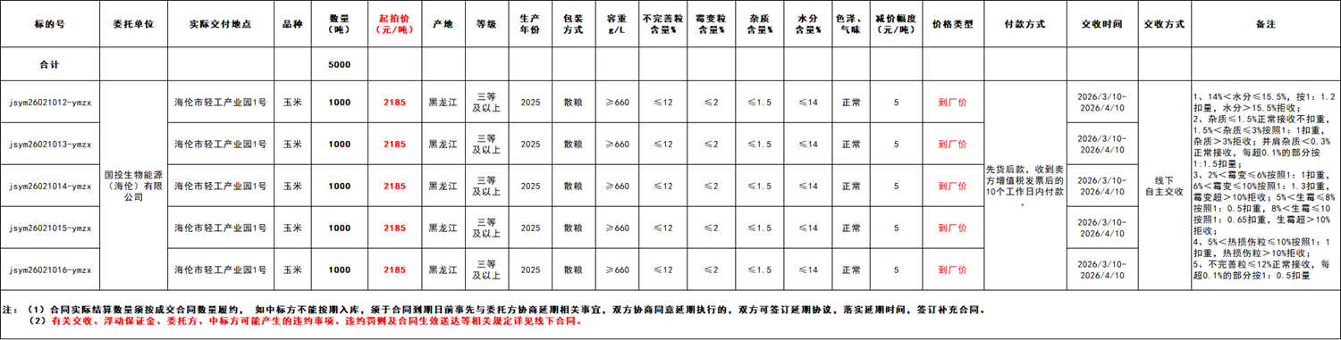 受国投生物能源(海伦)有限公司委托,江苏粮油商品交易市场暨玉米分中心定于2026年2月10日 14:30在“玉米分中心竞价采购交易专场”举办本次玉米竞价采购交易活动。具体事宜公告如下: