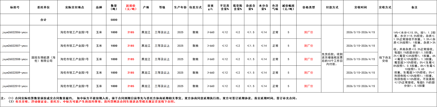 受国投生物能源(海伦)有限公司委托,江苏粮油商品交易市场暨玉米分中心定于2026年2月25日14:30 在“玉米分中心竞价采购交易专场”举办本次玉米竞价采购交易活动。具体事宜公告如下: