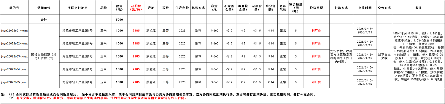 受国投生物能源(海伦)有限公司委托,江苏粮油商品交易市场暨玉米分中心定于2026年2月26日14:30 在“玉米分中心竞价采购交易专场”举办本次玉米竞价采购交易活动。具体事宜公告如下: