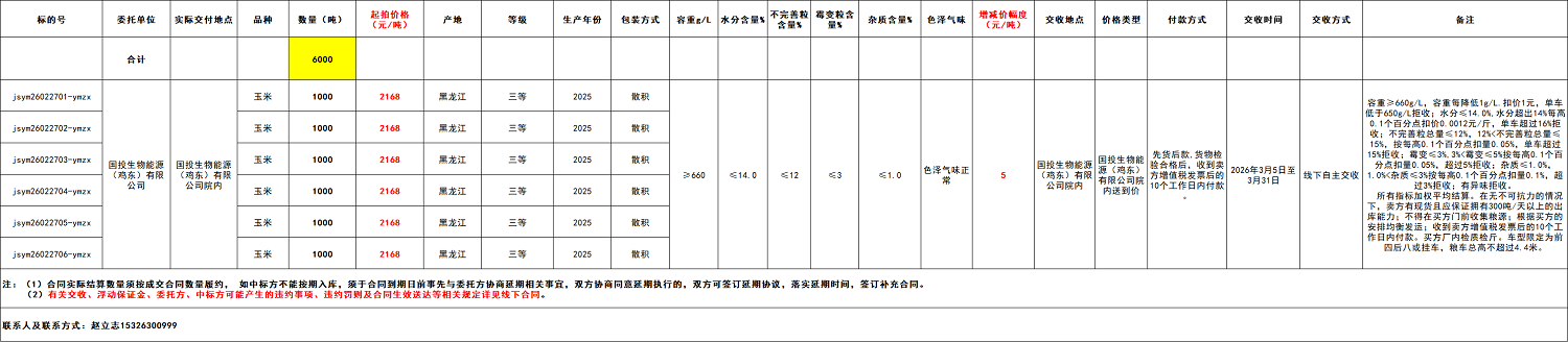 2.本次竞价采购交易起拍价:2168元/吨,竞价幅度为人民币5元/吨。交易价格类型为国投生物能源(鸡东)有限公司院内送到价。