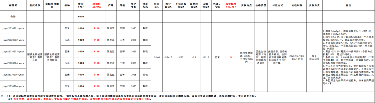 2.本次竞价采购交易起拍价:2168元/吨,竞价幅度为人民币5元/吨。交易价格类型为国投生物能源(鸡东)有限公司院内送到价。