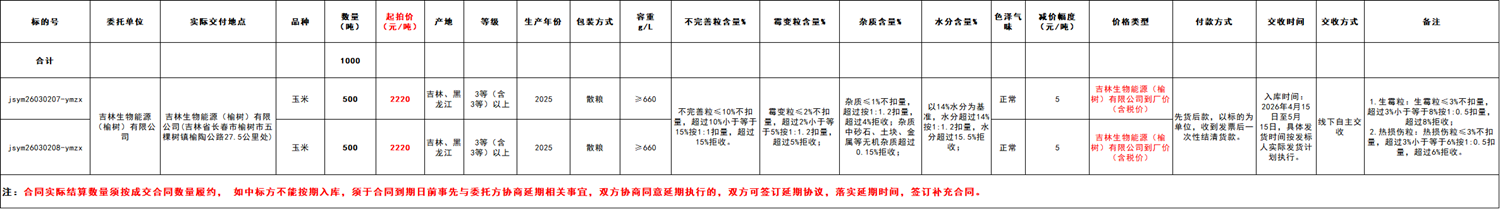 2.本次竞价采购交易起拍价:2220元/吨,竞价幅度为人民币5元/吨。交易价格类型为吉林生物能源(榆树)有限公司送到价。
