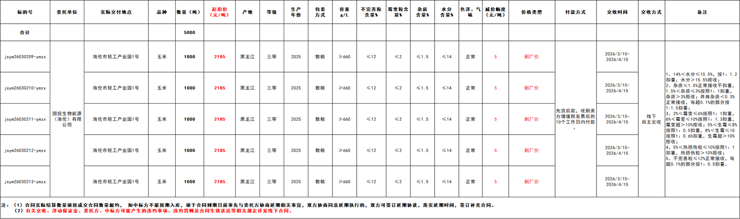 受国投生物能源(海伦)有限公司委托,江苏粮油商品交易市场暨玉米分中心定于2026年3月2日 14:30在“玉米分中心竞价采购交易专场”举办本次(商品粮)玉米竞价采购交易活动。具体事宜公告如下: