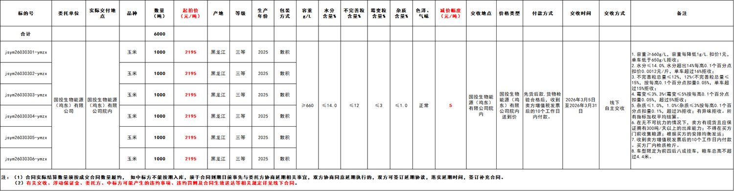 受国投生物能源(鸡东)有限公司委托,江苏粮油商品交易市场暨玉米分中心定于2026年3月3日 14:00在“玉米分中心竞价采购交易专场”举办本次商品玉米竞价采购交易活动。具体事宜公告如下: