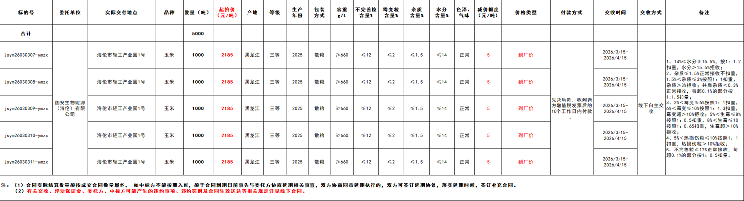 受国投生物能源(海伦)有限公司委托,江苏粮油商品交易市场暨玉米分中心定于2026年3月3日 14:30在“玉米分中心竞价采购交易专场”举办本次商品玉米竞价采购交易活动。具体事宜公告如下: