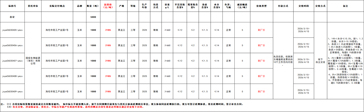 受国投生物能源(海伦)有限公司委托,江苏粮油商品交易市场暨玉米分中心定于2026年3月4日 14:30在“玉米分中心竞价采购交易专场”举办本次商品玉米竞价采购交易活动。具体事宜公告如下: