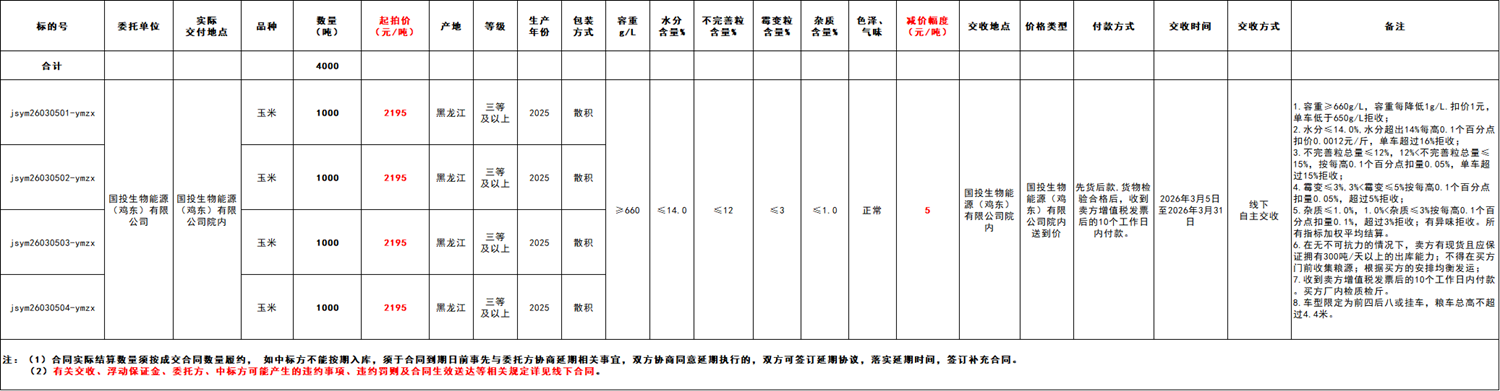 受国投生物能源(鸡东)有限公司委托,江苏粮油商品交易市场暨玉米分中心定于2026年3月5日 14:00在“玉米分中心竞价采购交易专场”举办本次商品玉米竞价采购交易活动。具体事宜公告如下: