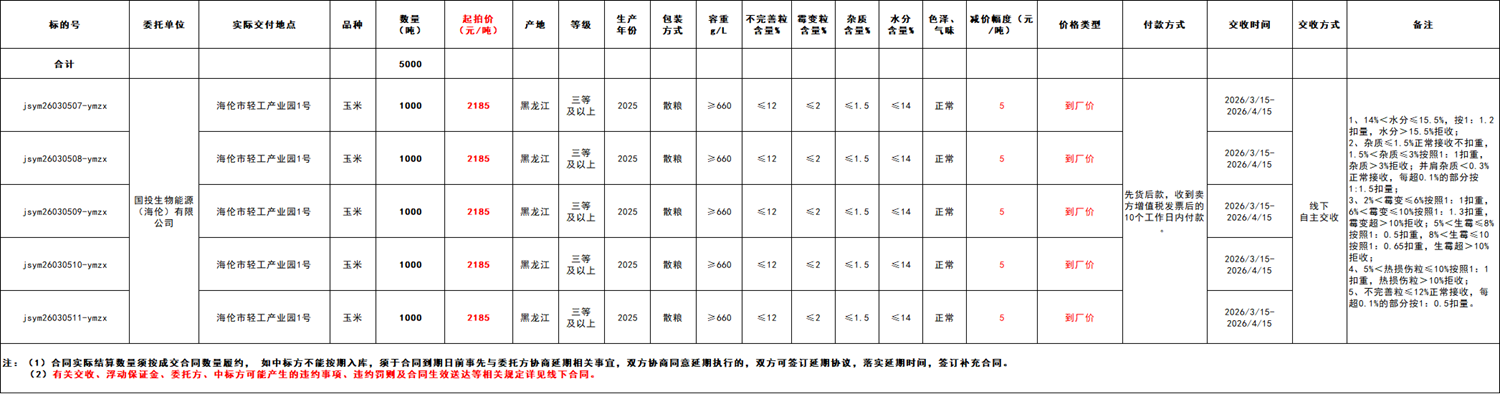 受国投生物能源(海伦)有限公司委托,江苏粮油商品交易市场暨玉米分中心定于2026年3月5日 14:30在“玉米分中心竞价采购交易专场”举办本次商品玉米竞价采购交易活动。具体事宜公告如下: