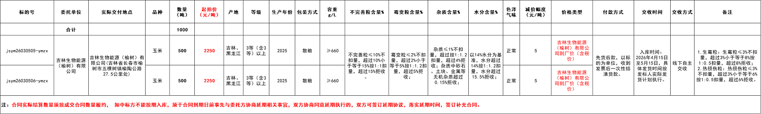 2.本次竞价采购交易起拍价:2250元/吨,竞价幅度为人民币5元/吨。交易价格类型为吉林生物能源(榆树)有限公司送到价。