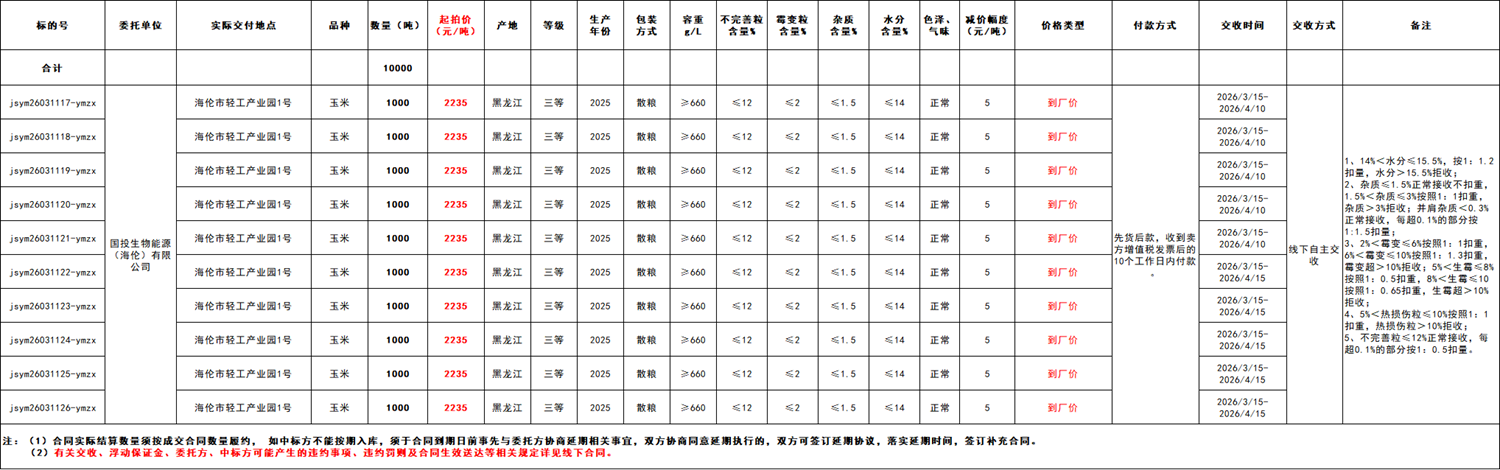 受国投生物能源(海伦)有限公司委托,江苏粮油商品交易市场暨玉米分中心定于2026年3月11日 14:30在“玉米分中心竞价采购交易专场”举办本次商品玉米竞价采购交易活动。具体事宜公告如下: