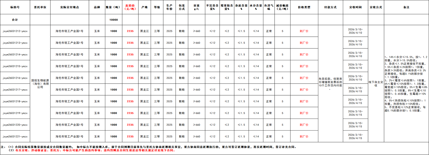 受国投生物能源(海伦)有限公司委托,江苏粮油商品交易市场暨玉米分中心定于2026年3月12日14:30 在“玉米分中心竞价采购交易专场”举办本次商品玉米竞价采购交易活动。具体事宜公告如下: