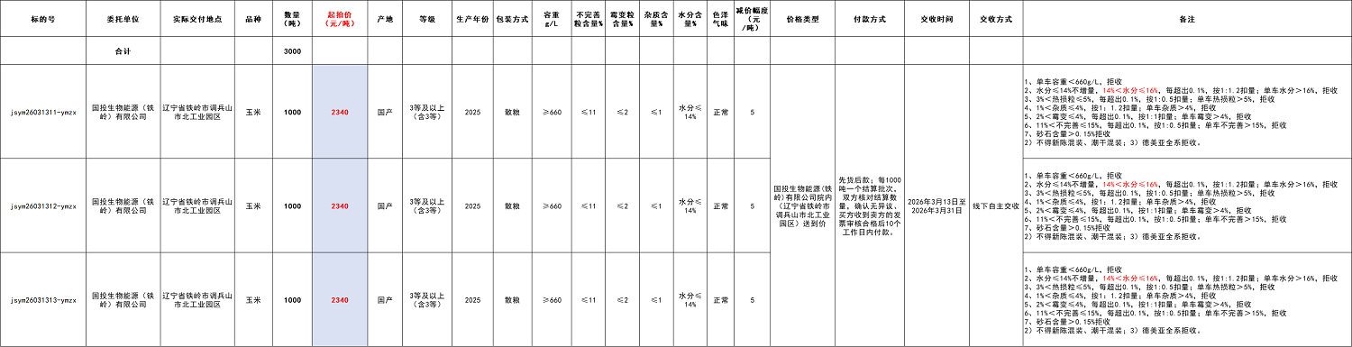 受国投生物能源(铁岭)有限公司委托,江苏粮油商品交易市场暨玉米分中心定于2026年3月13日 13:30 在“玉米分中心竞价采购交易专场”举办本次玉米竞价采购交易活动。具体事宜公告如下: