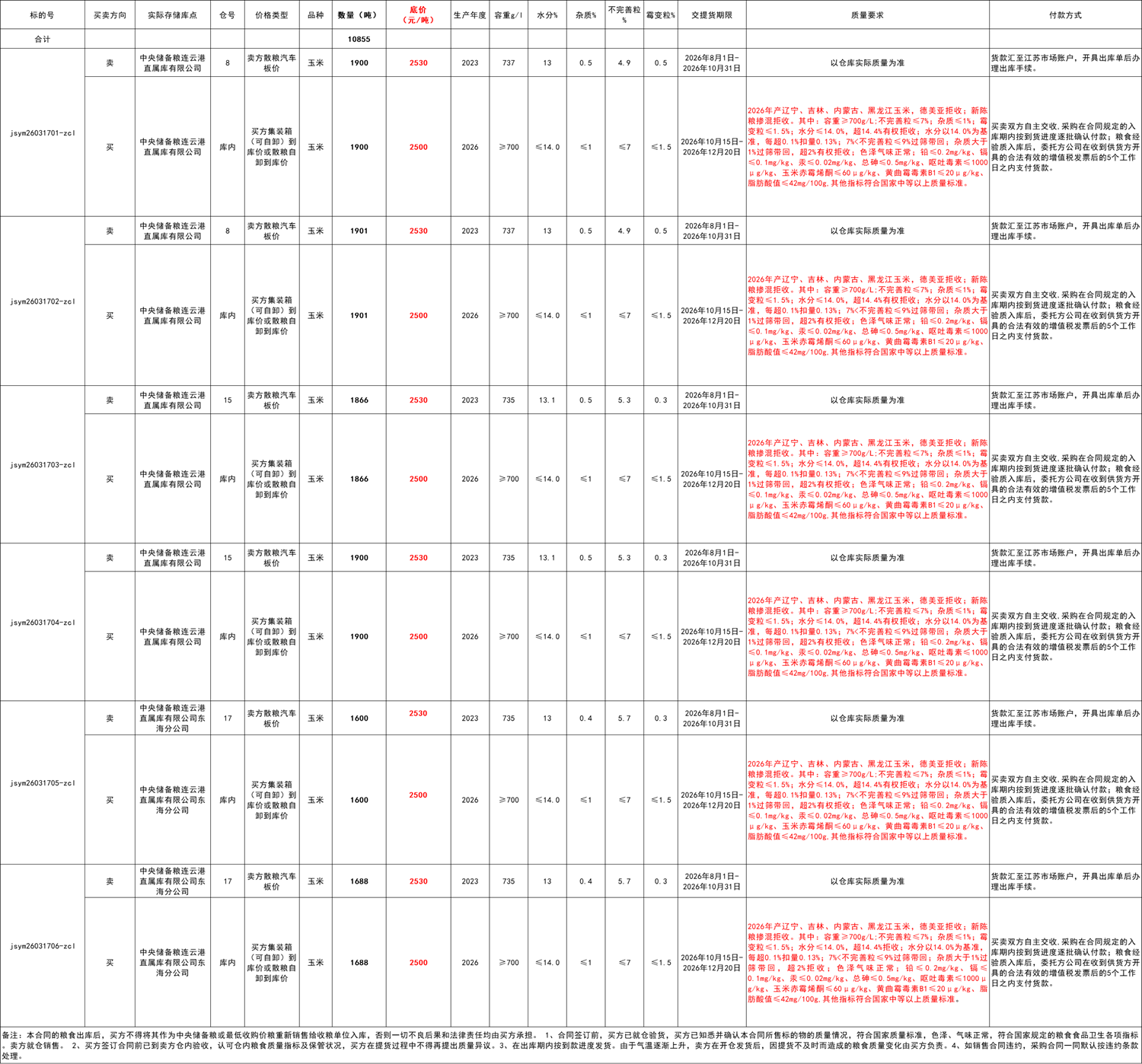 1.1品种及数量:10855吨 玉米, 分6个标的(详见交易清单)。