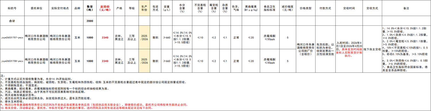 2.本次竞价采购交易起拍价:2340元/吨,竞拍减价幅度为人民币5元/吨。交易价格类型为梅河口市阜康酒精有限责任公司到厂价格(含税)。