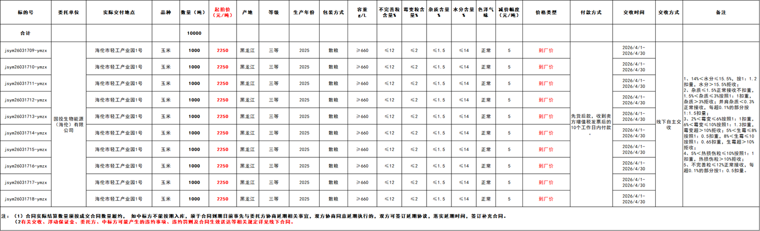 受国投生物能源(海伦)有限公司委托,江苏粮油商品交易市场暨玉米分中心定于2026年3月17日 14:30 在“玉米分中心竞价采购交易专场”举办本次商品玉米竞价采购交易活动。具体事宜公告如下: