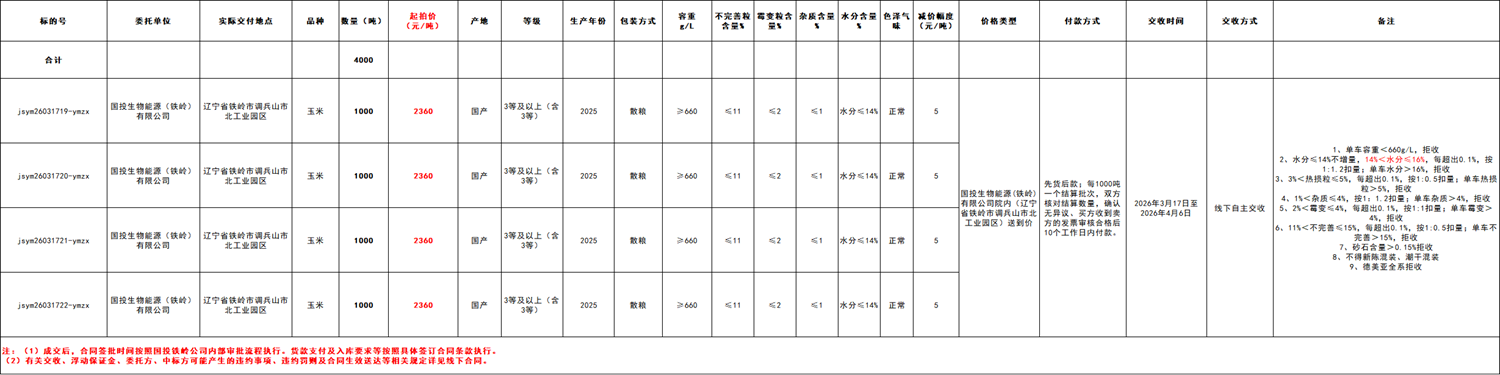 2.本次竞价采购交易起拍价:2360元/吨,竞拍减价幅度为人民币5元/吨。交易价格类型为国投生物能源(铁岭)有限公司院内(辽宁省铁岭市调兵山市北工业园区)送到价。