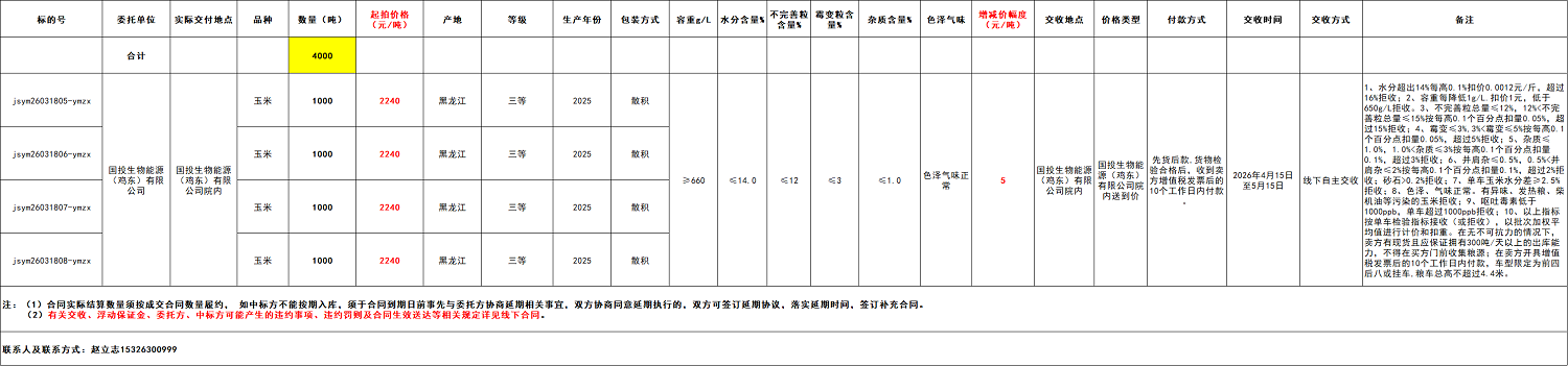 2.本次竞价采购交易起拍价:2240元/吨,竞价幅度为人民币5元/吨。交易价格类型为国投生物能源(鸡东)有限公司院内送到价。