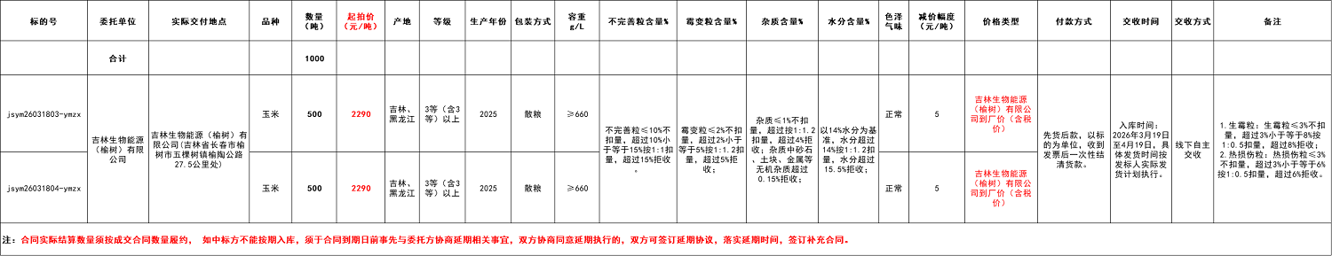 2.本次竞价采购交易起拍价:2290元/吨,竞价幅度为人民币5元/吨。交易价格类型为吉林生物能源(榆树)有限公司送到价。