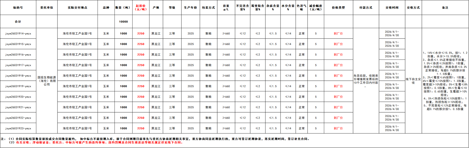 受国投生物能源(海伦)有限公司委托,江苏粮油商品交易市场暨玉米分中心定于2026年3月19日 14:30在“玉米分中心竞价采购交易专场”举办本次商品玉米竞价采购交易活动。具体事宜公告如下: