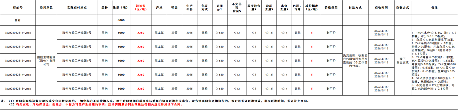 2.本次竞价采购交易起拍价:2260元/吨,竞拍减价幅度为人民币5元/吨。交易价格类型为海伦市轻工产业园1号到厂价。
