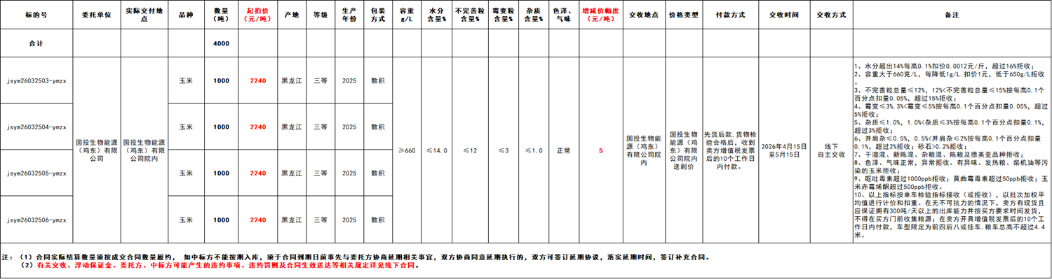 受国投生物能源(鸡东)有限公司委托,江苏粮油商品交易市场暨玉米分中心定于2026年3月25日 14:00在“玉米分中心竞价采购交易专场”举办本次商品玉米竞价采购交易活动。具体事宜公告如下:
