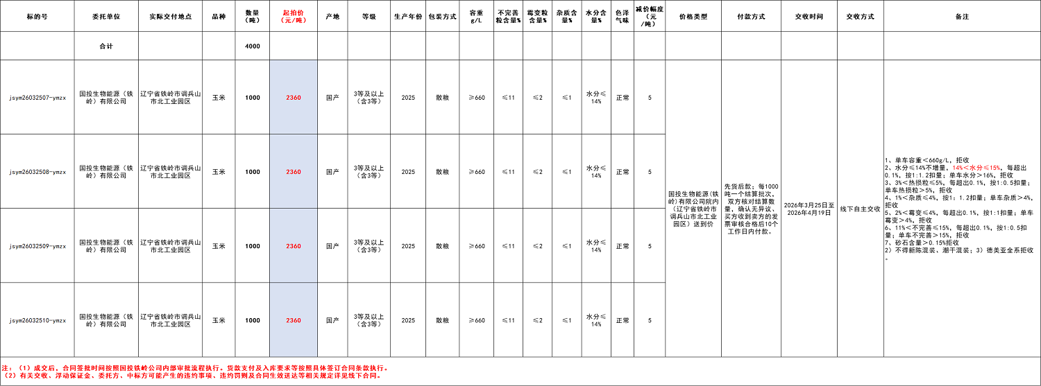 受国投生物能源(铁岭)有限公司委托,江苏粮油商品交易市场暨玉米分中心定于2026年3月25日 13:30 在“玉米分中心竞价采购交易专场”举办本次玉米竞价采购交易活动。具体事宜公告如下: