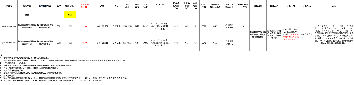 2.本次竞价采购交易起拍价:2330元/吨,竞拍减价幅度为人民币5元/吨。交易价格类型为梅河口市阜康酒精有限责任公司到厂价格(含税)。