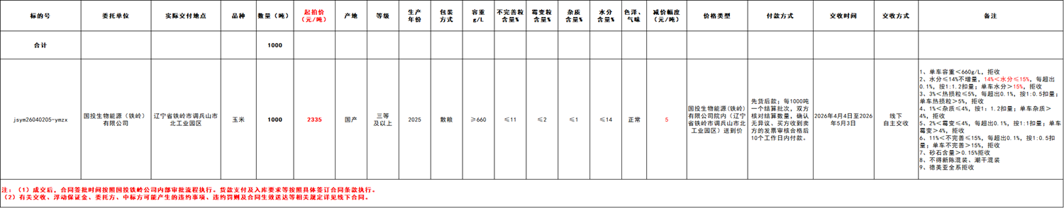2.本次竞价采购交易起拍价:2335元/吨,竞拍减价幅度为人民币5元/吨。交易价格类型为国投生物能源(铁岭)有限公司院内(辽宁省铁岭市调兵山市北工业园区)送到价。