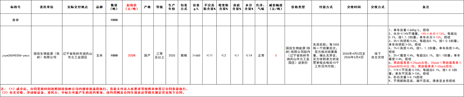 受国投生物能源(铁岭)有限公司委托,江苏粮油商品交易市场暨玉米分中心定于2026年4月3日 13:30 在“玉米分中心竞价采购交易专场”举办本次商品玉米竞价采购交易活动。具体事宜公告如下: