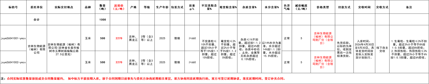 2.本次竞价采购交易起拍价:2270元/吨,竞价幅度为人民币5元/吨。交易价格类型为吉林生物能源(榆树)有限公司到厂价(含税价)。