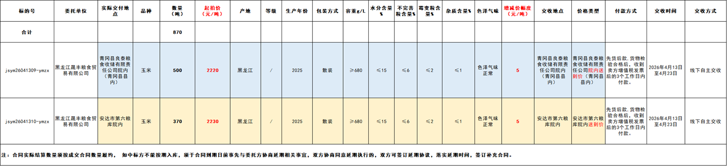 受黑龙江晟丰粮食贸易有限公司委托,江苏粮油商品交易市场暨玉米分中心定于2026年4月13日13:40 在“玉米分中心竞价采购交易专场”举办本次商品玉米竞价采购交易活动。具体事宜公告如下:
