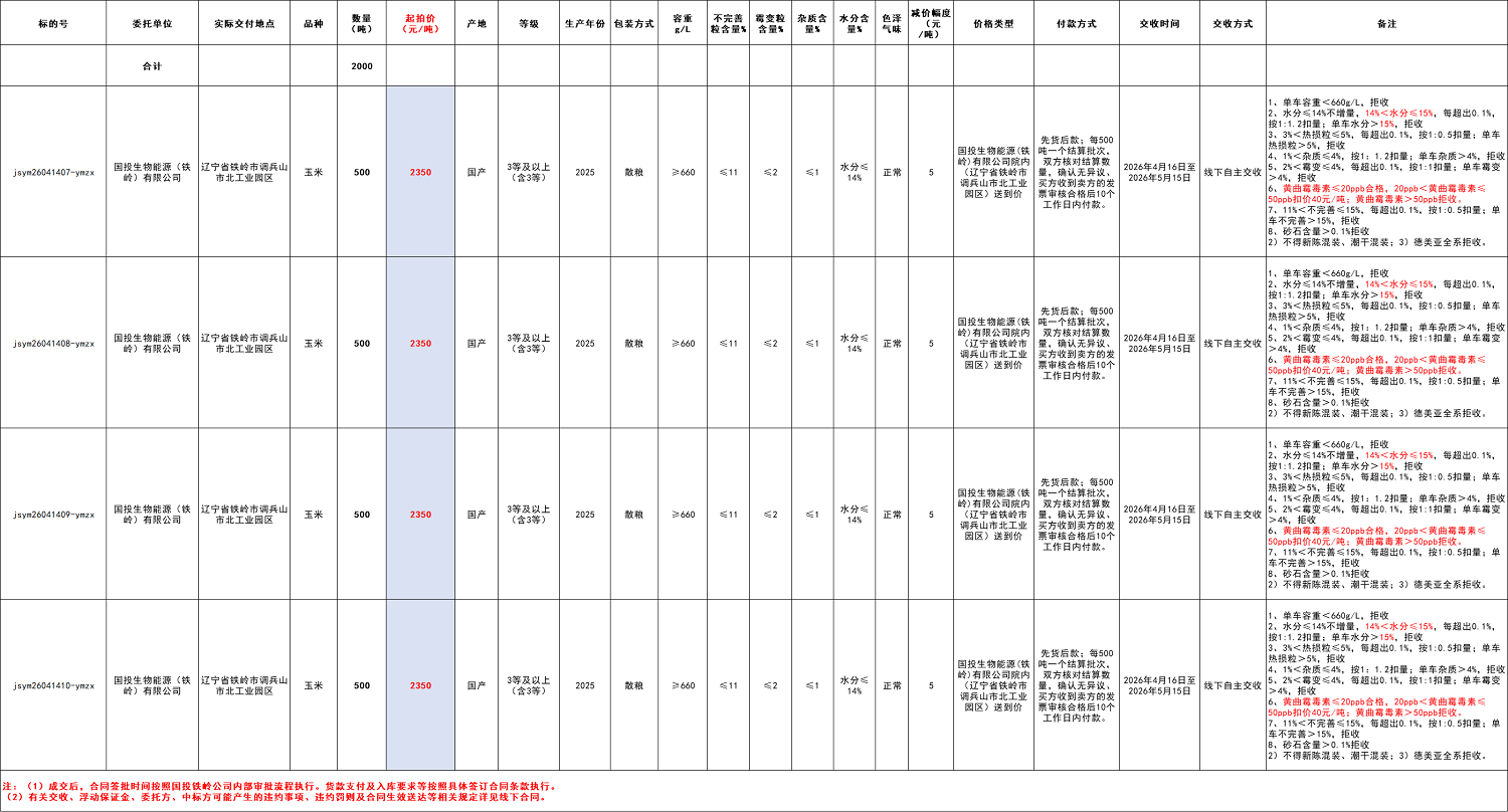 2.本次竞价采购交易起拍价:2350元/吨,竞拍减价幅度为人民币5元/吨。交易价格类型为国投生物能源(铁岭)有限公司院内(辽宁省铁岭市调兵山市北工业园区)送到价。
