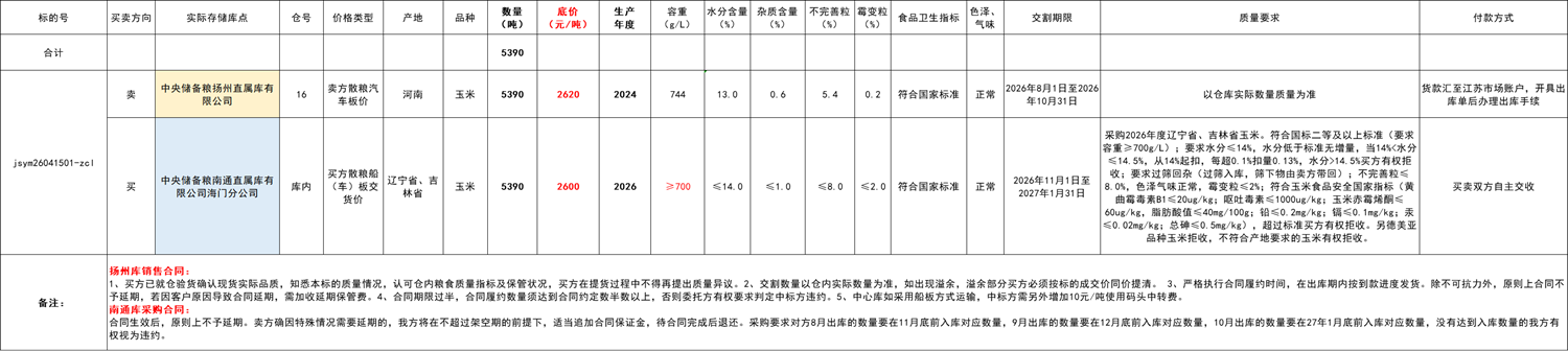 受中央储备粮扬州直属库有限公司、中央储备粮南通直属库有限公司委托,江苏粮油商品交易市场举办本次玉米购销双向竞价交易活动。具体事宜公告如下: