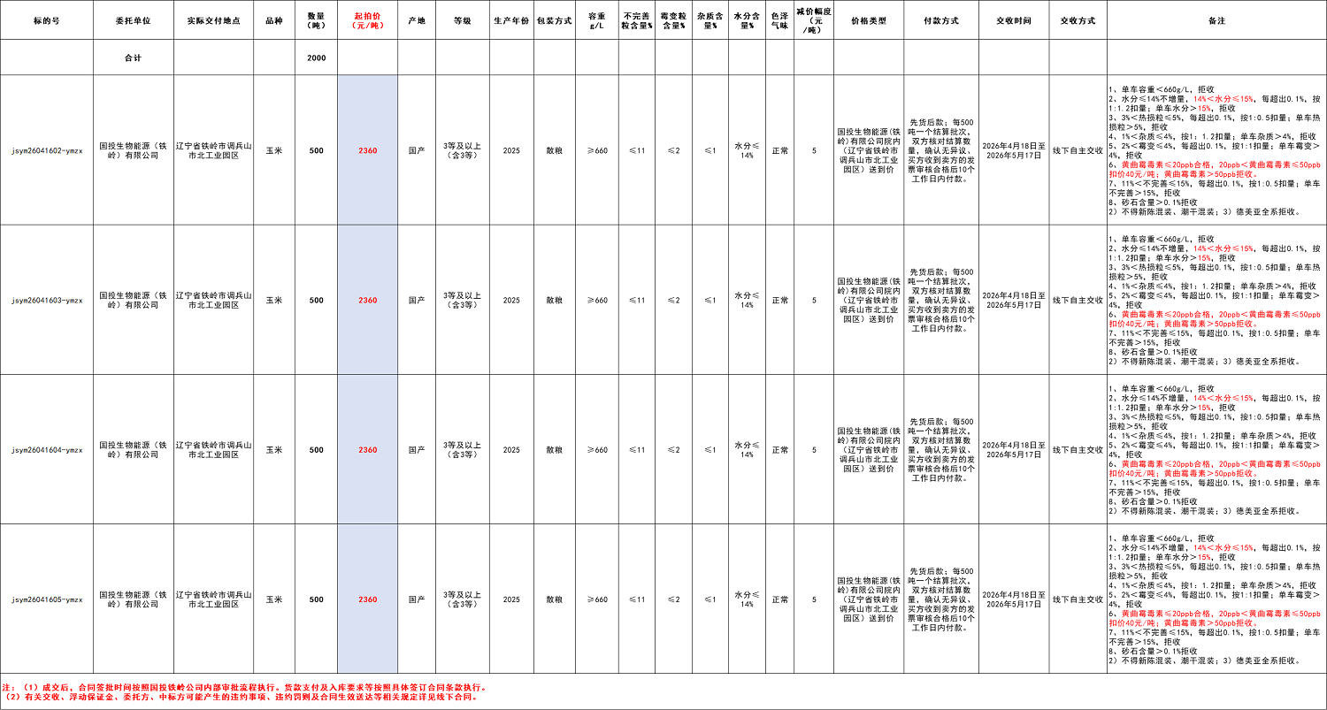 2.本次竞价采购交易起拍价:2360元/吨,竞拍减价幅度为人民币5元/吨。交易价格类型为国投生物能源(铁岭)有限公司院内(辽宁省铁岭市调兵山市北工业园区)送到价。