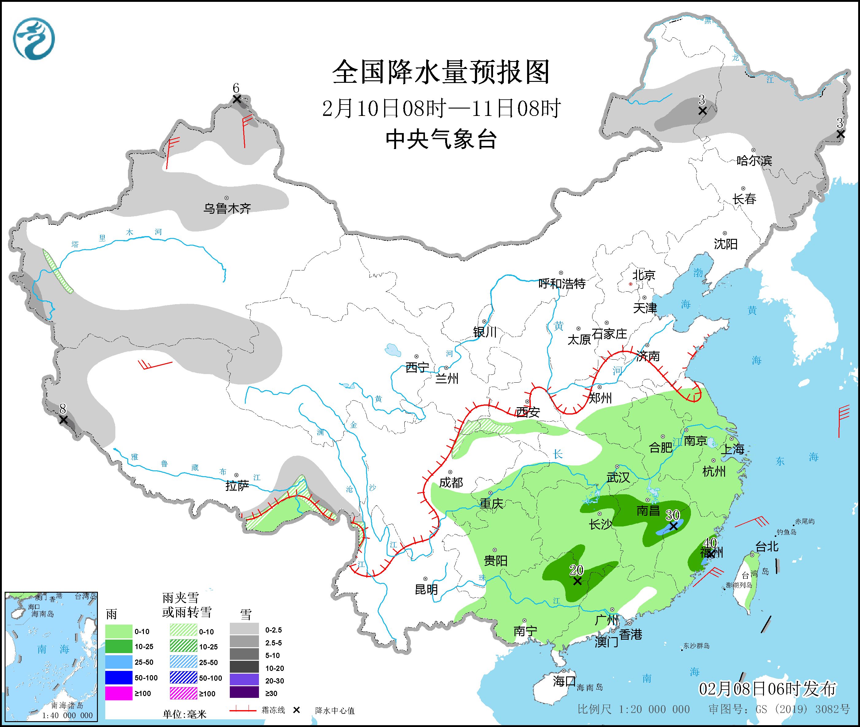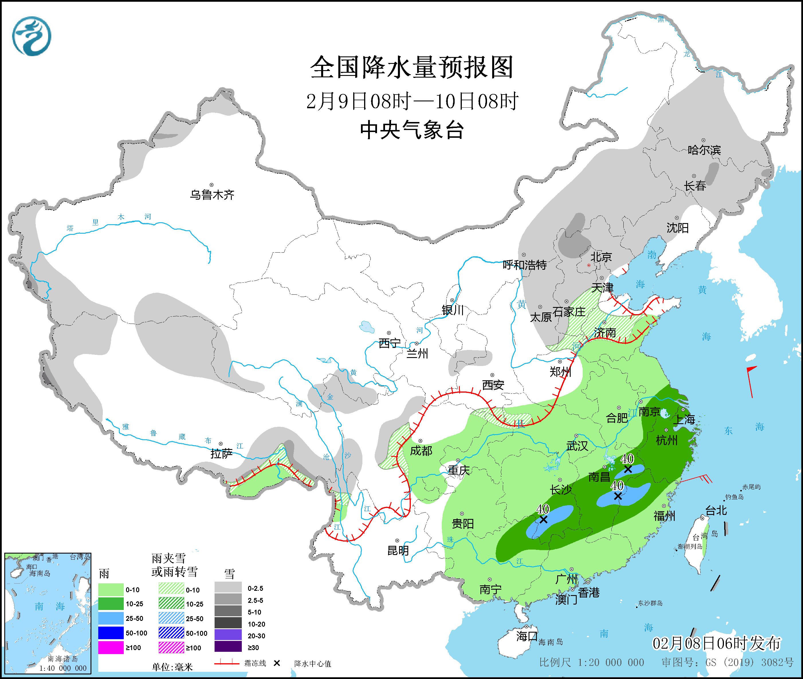 2月9日08时至10日08时,新疆北疆西北部和南疆山区、西藏东部和北部、青海南部、川西高原北部、内蒙古东部、东北地区、华北、黄淮北部等地部分地区有小到中雪或雨夹雪。黄淮中东部、江淮、江汉、江南、西南地区东部、华南等地部分地区有小到中雨,其中,湖南南部、江西东部、福建西部、广西东北部等地局地有大雨(25~40毫米)(见图3)。