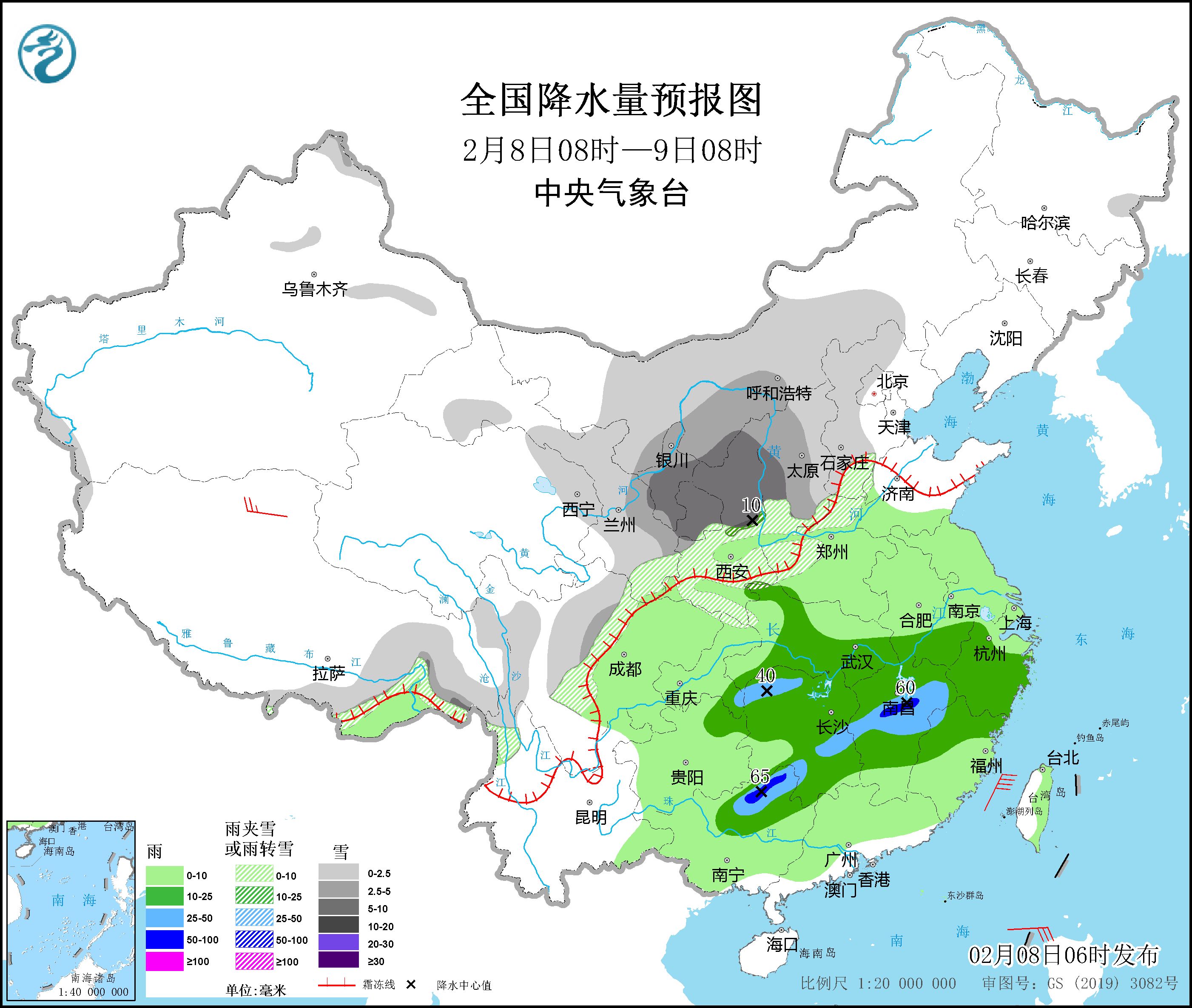 2月8日08时至9日08时,西藏东部、川西高原、西北地区中东部、华北中西部、黄淮西部等地部分地区有小到中雪或雨夹雪,其中,内蒙古河套地区、甘肃东部、宁夏、陕西北部和秦岭山区、山西西南部等地部分地区有大雪,陕西中北部局地有暴雪;西南地区东部、江淮、江汉、江南、华南大部等地部分地区有小到中雨,其中,广西北部、湖南西北部和东部、江西中北部等地部分地区有大雨,局地暴雨(50~65毫米)(见图2)。