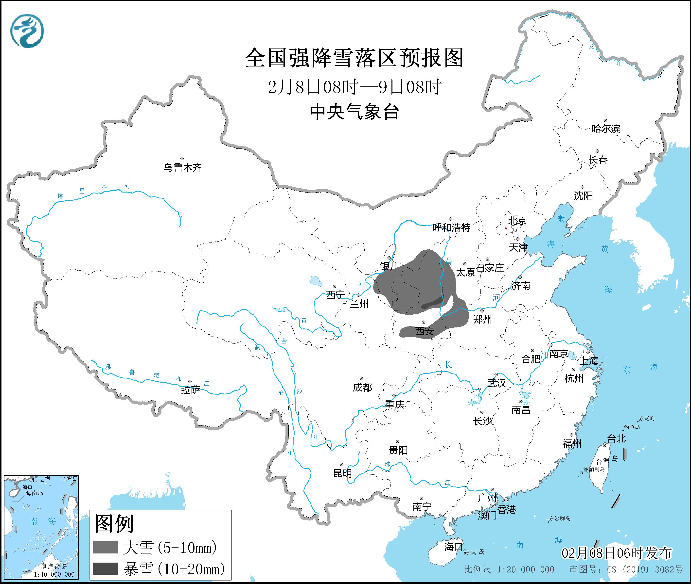 8日至9日,中东部地区将出现大范围雨雪天气过程,江汉、江淮、江南、华南北部等地有中到大雨,部分地区暴雨;西藏东部、西北地区、华北、黄淮西部等地有小到中雪或雨夹雪,部分地区有大雪,局地暴雪。预计2月8日08时至2月9日08时,内蒙古河套地区、甘肃东部、宁夏大部、陕西北部和秦岭山区、山西西南部、河南西部等地部分地区有大雪,其中,陕西中北部局地有暴雪。上述部分地区新增积雪深度4~8厘米,局地可达10厘米以上。中央气象台2月8日06时继续发布暴雪蓝色预警(见图1)。
