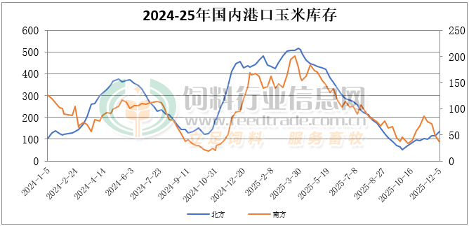 截至12月5日北方港口四港玉米库存共计约136万吨。北方港口库存不足于满足装船任务需求,贸易商继续提价促量。截止周五广东港口玉米库存35万吨,内贸玉米日均出货在3.4万吨。饲企高价建库意愿不强,以滚动建库为主。部分饲企寻求低价替代谷物,进口大麦等谷物的询价已启动,预计明年一季度进口谷物到货量可能增加。