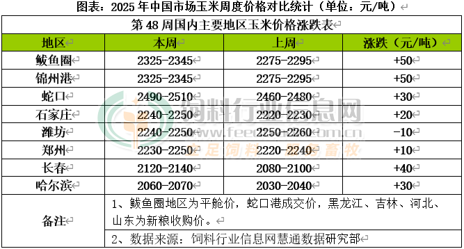 国内主产区随着玉米价格高企,基层种植户惜售情绪减弱,新粮上市速度略有加快,用粮企业对高价玉米承接能力有限,补库节奏放缓,价格上涨势头有所减弱。东北产地降雪天气影响减弱,北方港口汽运到港量小幅回升,贸易商仍有一批合同粮要执行,下游船期依旧密集,采购需求旺盛,报价维持坚挺,其中锦州港周比上涨50元/吨;北港阶段发运不畅,南方港口可售内贸玉米供应趋紧,饲企持观望心态增加,受成本支撑报价趋强,其中蛇口港周比上涨30元/吨。国内玉米现货价格基本稳定,局部价格震荡走高。东北产区气温下降较快,且新季玉米含水量偏低,种植户惜售心态渐趋浓,看涨心态较为明显,贸易商采购积极,深加工企业库存同比偏低,利润逐步回升,行业开工率显著提升,对玉米存在刚性采购需求,部分深加工加价提量,其中长春周比上涨40元/吨;华北黄淮产区冬小麦播种陆续结束,基层种植户出粮节奏加快,基层农户和贸易商逢利出货叠加,基层潮粮上市增多,叠加部分东北粮源调入,市场粮源供应明显增加,深加工企业顺势压价,收购价普遍下调,其中潍坊周比下跌10元/吨。