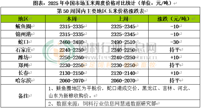 国内受调节性储备粮投放传闻影响,市场恐高心理开始显现,种植户与贸易主体开始释放粮源,粮源库存流通加快,有效缓解了短期供需紧张,用粮企业采购积极性受限,价格上涨速度有所放缓。东北产地降雪天气及物流紧张导致北方港口汽运集港量减少,贸易商有前期合同待执行,但贸易利润缩水及盘面持续回落利空,部分贸易商小幅降价收购,其中锦州港周比下跌 10元/吨;南方港口到货预期增量,进口玉米和进口大麦等替代谷物优势明显,制约饲企采购心态,可售现货库存偏低支撑贸易商降价空间有限,其中蛇口港周比下跌30元/吨。国内玉米现货价格基本稳定,局部价格窄幅震荡。东北产区基层可售粮源已逐步减少,收储库点持续增多,轮换玉米的采购量也在增加,部分粮库提高收购价,对市场底部构成支撑;随着玉米价格涨到阶段性高位,下游产品价格上涨不足,深加工企业高价补库节奏放缓,部分深加工被迫减产,多数企业开始进入观望状态,上涨范围缩小,个别企业试探性压价,其中长春周比上涨10元/吨;华北黄淮产区基层售粮情绪有所升温,贸易商购销多数以潮粮为主,不宜做长期存储,整体出货意愿增强,市场流通量有所增加,经过前期补库饲料及深加工企业库存水平有所增加,临近年底企业仍有补库的需求,多数用粮企业根据到货量灵活调价,其中潍坊周比上涨10元/吨。