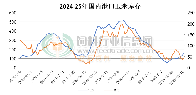 截至12月12日北方港口四港玉米库存共计约153万吨。北方港口贸易商陆续执行前期签订合同,库存大幅低于去年同期。截止周五广东港口玉米库存45万吨,内贸玉米日均出货在3.4万吨。下游消费无明显好转,饲料企业采购积极性不强,继续持观望心态。