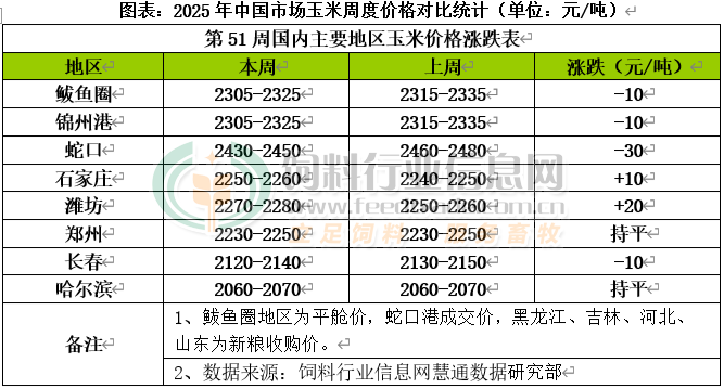 国内降雪天过去物流运输逐步恢复,加之进口玉米投放加码,贸易商售粮积极性提高,加工企业到货量快速增加,用粮企业库存已有所积累,高位建库意愿减弱,市场购销活跃度一般,价格窄幅调整。天气影响减弱,北方港口晨间到货量逐步恢复,贸易商收购积极,等待装运船期仍较多,为了控制到货量贸易商收购价格小幅下跌,其中锦州港周比下跌 10元/吨;南方港口到货船期增多,供需趋于宽松,进口谷物价格相对便宜,内贸玉米优势有所下降,饲料企业采购放缓,成交偏淡,市场整体心态偏弱,其中蛇口港周比下跌30元/吨。国内玉米现货价格基本稳定,局部价格小幅震荡。东北产区中储粮玉米轮换采购有所上升,带动新季玉米上市进度同比偏快。受进口玉米定向投放影响,贸易商售粮积极性小幅提高,逢高售粮变现,市场流通以难以储存的潮粮为主,加工企业对于潮粮采购积极性不高,下游企业已建立一定库存,对高价承接力度有所不足,收购价格小幅偏弱调整,其中长春周比下跌10元/吨;华北黄淮产区周初随着运输恢复正常,市场流通粮源大幅增多,用粮企业厂门到货量明显增加,收购价格小幅走低,随着价格下调基层种植户惜售情绪转浓,贸易商收粮难度增加,受运力紧张东北粮源外运成本上升,东北粮源调入量有所减少,新粮上市量有所减少,部分用粮企业收购价窄幅调整,其中潍坊周比上涨20元/吨。