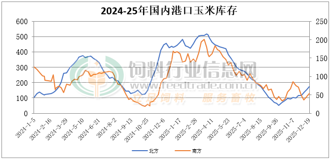 截至12月19日北方港口四港玉米库存共计约172万吨。北方港口库存较前期小幅提升,但同比仍处于历史偏低水平。截止周五广东港口玉米库存54万吨,内贸玉米日均出货在3.5万吨。进口高粱、大麦价格优势明显,一定程度上压制内贸玉米需求,饲企以提货为主。