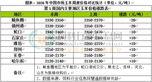 国内主产区种植户有序售粮,余粮出售速度加快,企业在节前仍有补库需求,采购节奏保持平稳,现货行情延续震荡略强态势。北方港口贸易商提价收购后,集港量维持在相对高位水平,下游采购需求减少,叠加期货盘面走弱,贸易商收购态度偏谨慎,收购价格小幅走弱,其中锦州港周比下跌20元/吨;南方港口到货船期增加,进口高粱、大麦价格优势凸出,饲料企业采购较多,挤占内贸玉米的需求,饲料企业多执行前期合同,持续备货情绪不高,贸易商报价小幅下跌,其中蛇口港周比下跌10元/吨。国内玉米现货价格基本稳定,局部价格小幅震荡。东北产区随着年关临近,基层种植户售粮心态松动,出粮速度较前期偏快,深加工企业及饲料企业库存已升至一个月以上,多以随用随采为主,供应增量不多,收购价格窄幅波动,其中哈尔滨周比上涨10元/吨;华北黄淮产区随天气转晴运输改善,基层售粮节奏有所加快,当前售粮进度已超五成,种植户对优质粮仍存惜售心态,市场流通量维持低位,贸易商节前择优建库,随着库存逐渐增多,多数深加工企业已建立安全库存,采购观望情绪明显升温,收购价格随到货情况灵活调整,其中潍坊周比上涨10元/吨。